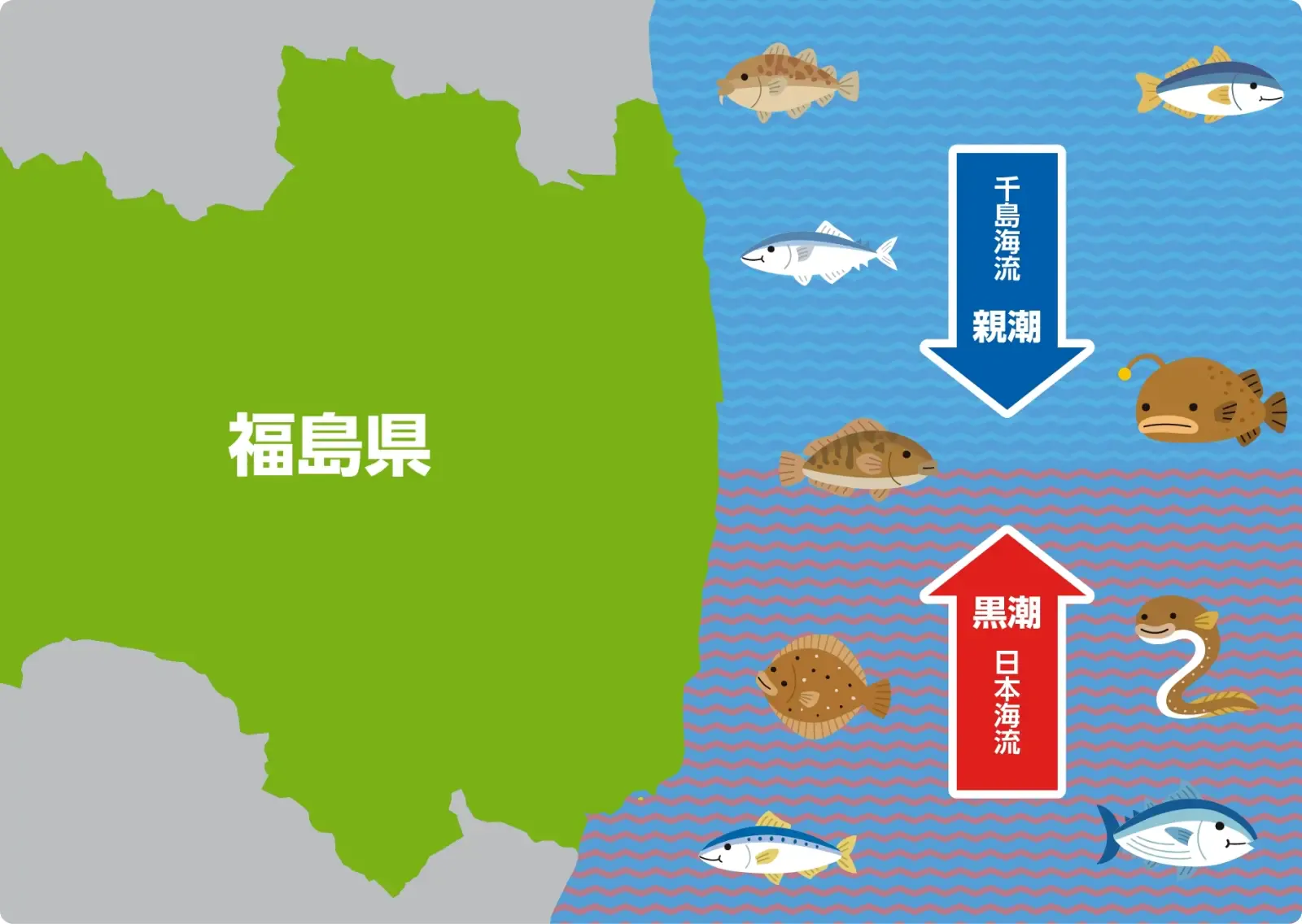 水温、塩分濃度、流れの速さなどが異なる「黒潮(暖流=日本海流)」と「親潮(寒流=千島海流)」がぶつかる「潮目」の海、福島県沖──暖流に棲む魚と、寒流に棲む魚の両方が集まるので、魚種が豊富です。豊富に発生するプランクトンを小魚が食べ、その小魚を大型魚が餌にします。潮の速い流れが、魚の身を引き締めます。ちなみに「親潮」は“魚を「親」のように育てる「潮」”という意味です。福島県沖で獲れる魚は、古くから「常磐もの」と呼ばれ、その美味しさは、味に厳しい築地市場(豊洲市場)でも高い評価を得てきました。「常磐もの」が水揚げされる漁港が並ぶ福島の「浜通り」地方には、漁師飯や郷土料理をはじめ、「常磐もの」ならではの美味しさを堪能できる料理と、その調理法が脈々と伝えられています。