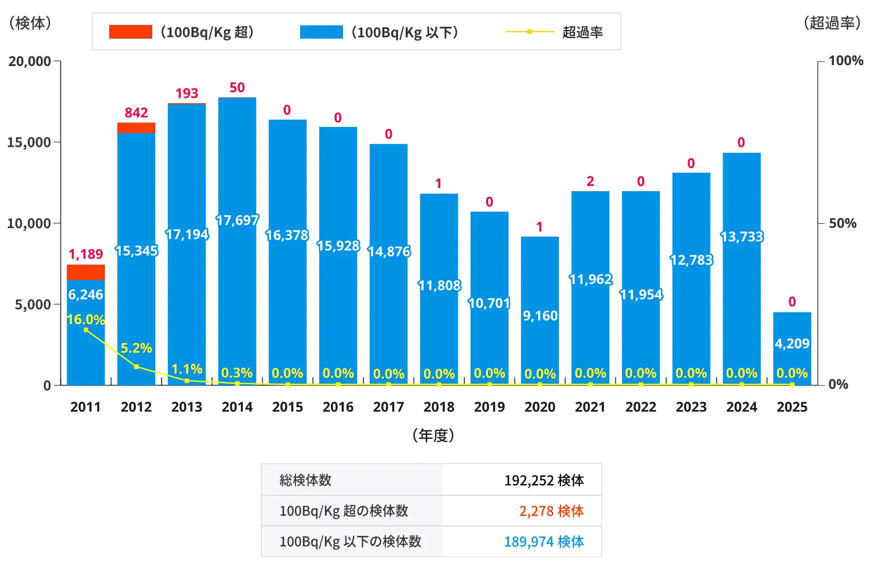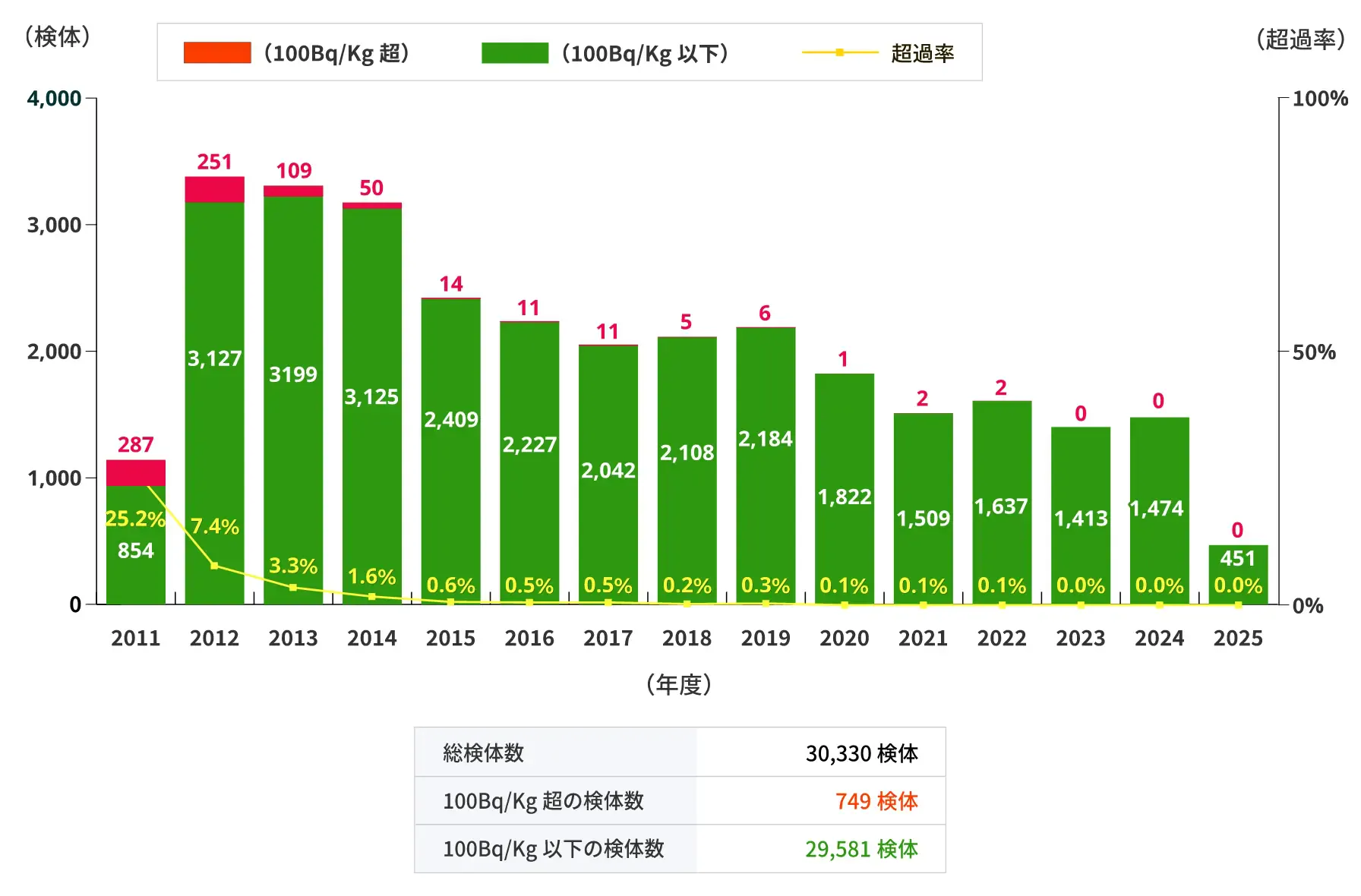 事故直後の2011年は、放射性セシウム濃度が100Bq/kgを超える検体が約40%を占めていましたが、その後速やかに減少しました。