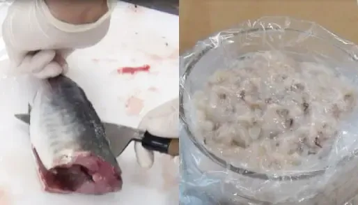 水産物の検査には、ゲルマニウム半導体検出器という測定器が使われています。この測定器で放射能を測るには、試料を一定の形にする必要があるので、魚をそのまま丸ごとでは測れません。そのため、水産物はミンチにします。