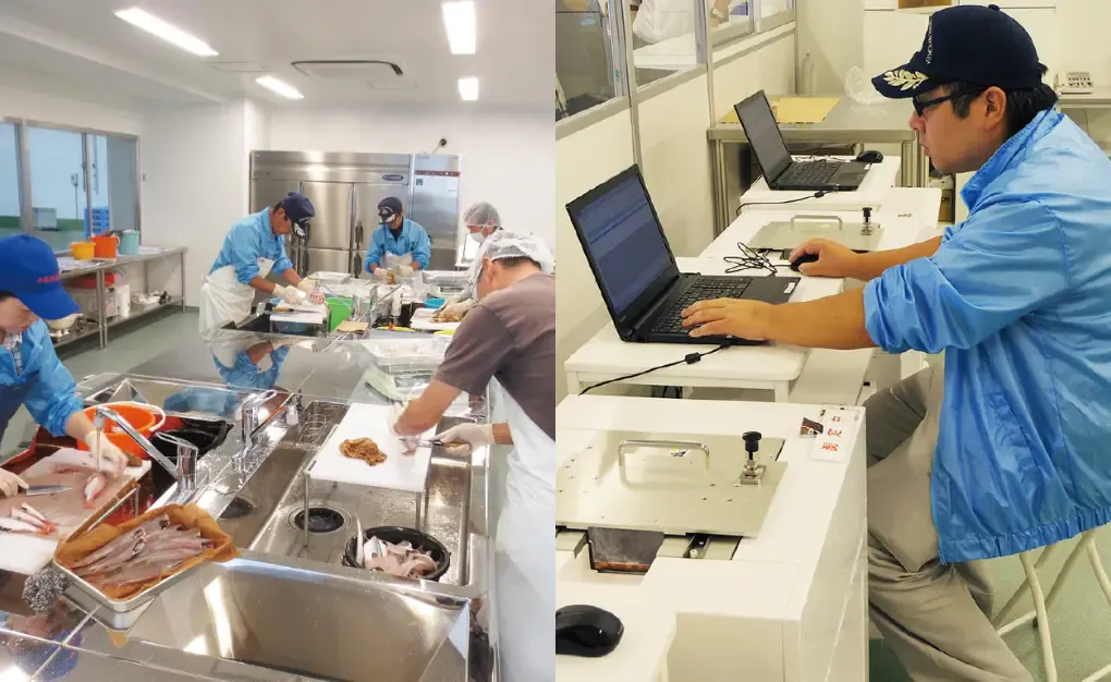 水揚げ日毎、魚種毎に一検体以上採取します。表面の汚れを落とし、食べる形態に合わせて処理します。検査機器の特性に合わせて、ミンチや切り身にします。