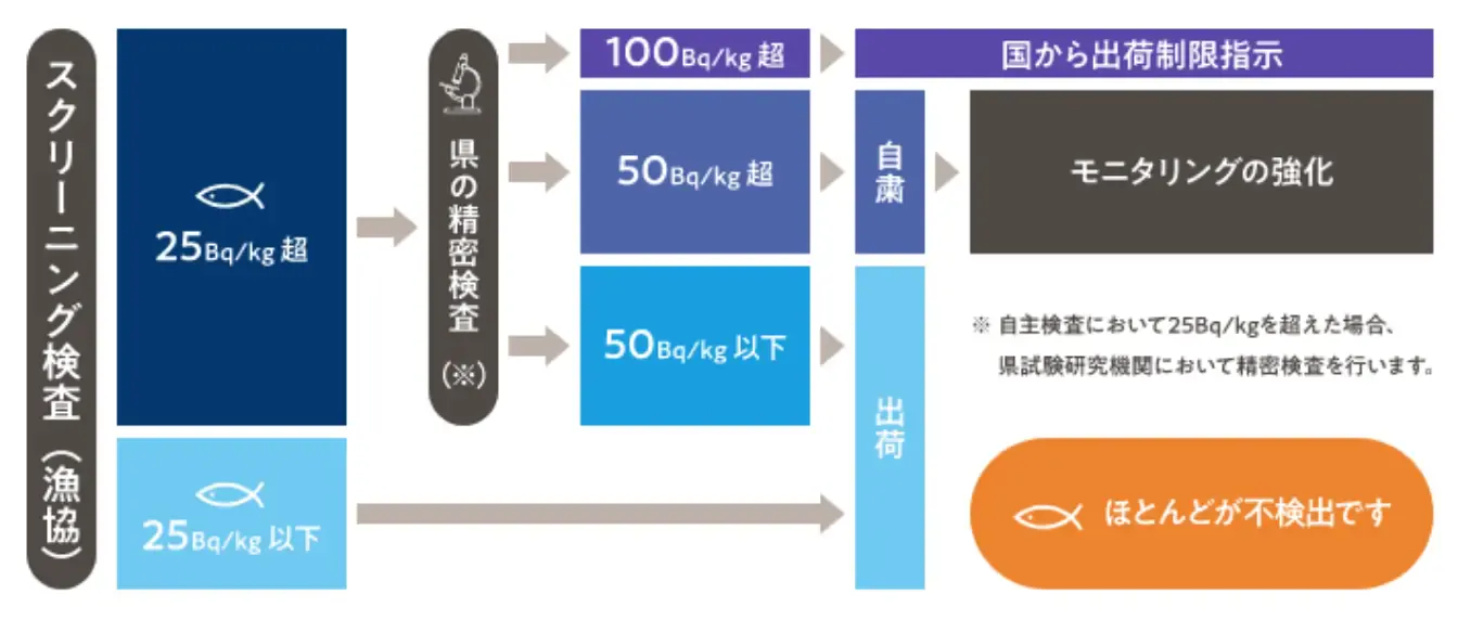 福島県で漁獲された水産物は、市場に流通する前の段階で検査が行われ、基準値を超えた魚種は流通しません。